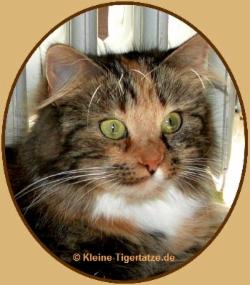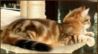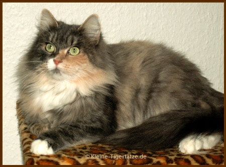 unbedingt erforderlich ist. Da die Katzen aber diese zusätzlichen Schmuseeinheiten sehr genießen, wenn sie von klein auf liebevoll mit der angenehmen Wirkung von Kamm und Bürste vertraut gemacht wurden, gönnt man ihnen die Prozedur sicher auch, ohne die unbedingte Notwendigkeit. Lediglich während des Fellwechsels im Frühjahr ist etwas mehr Augenmerk auf die Fellpflege zu legen, denn anderenfalls verknotet das tote Haar und außerdem verschluckt die Katze sonst zu viele Haare beim Putzen. Haarballen wären die Folge. Obendrein ist lose Katzenwolle im Kämmwerkzeug besser aufgehoben, als gleichmäßig im ganzen Haus verteilt. Beim Kämmen des Schwanzes muss allerdings ganz besondere Vorsicht walten. Es dauert sehr lange bis die ausgekämmten Haare nachgewachsen sind. Drei Jahre sind keine Seltenheit und wer ruiniert schon gerne sein Vorzeigestück? In die Badewanne müssen die Sibirischen Katzen eigentlich nur, wenn sie wirklich so verschmutzt sind, dass sie selbst beim Sauberlecken ihres Fells keine Chance mehr haben. |  Sibirische Katze blue-mc.-torbie /white