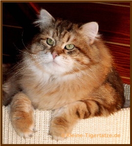 unbedingt erforderlich ist. Da die Katzen aber diese zusätzlichen Schmuseeinheiten sehr genießen, wenn sie von klein auf liebevoll mit der angenehmen Wirkung von Kamm und Bürste vertraut gemacht wurden, gönnt man ihnen die Prozedur sicher auch, ohne die unbedingte Notwendigkeit. Lediglich während des Fellwechsels im Frühjahr ist etwas mehr Augenmerk auf die Fellpflege zu legen, denn anderenfalls verknotet das tote Haar und außerdem verschluckt die Katze sonst zu viele Haare beim Putzen. Haarballen wären die Folge. Obendrein ist lose Katzenwolle im Kämmwerkzeug besser aufgehoben, als gleichmäßig im ganzen Haus verteilt. Beim Kämmen des Schwanzes muss allerdings ganz besondere Vorsicht walten. Es dauert sehr lange bis die ausgekämmten Haare nachgewachsen sind. Drei Jahre sind keine Seltenheit und wer ruiniert schon gerne sein Vorzeigestück? In die Badewanne müssen die Sibirischen Katzen eigentlich nur, wenn sie wirklich so verschmutzt sind, dass sie selbst beim Sauberlecken ihres Fells keine Chance mehr haben. |  Sibirische Katze blue-mc.-torbie /white